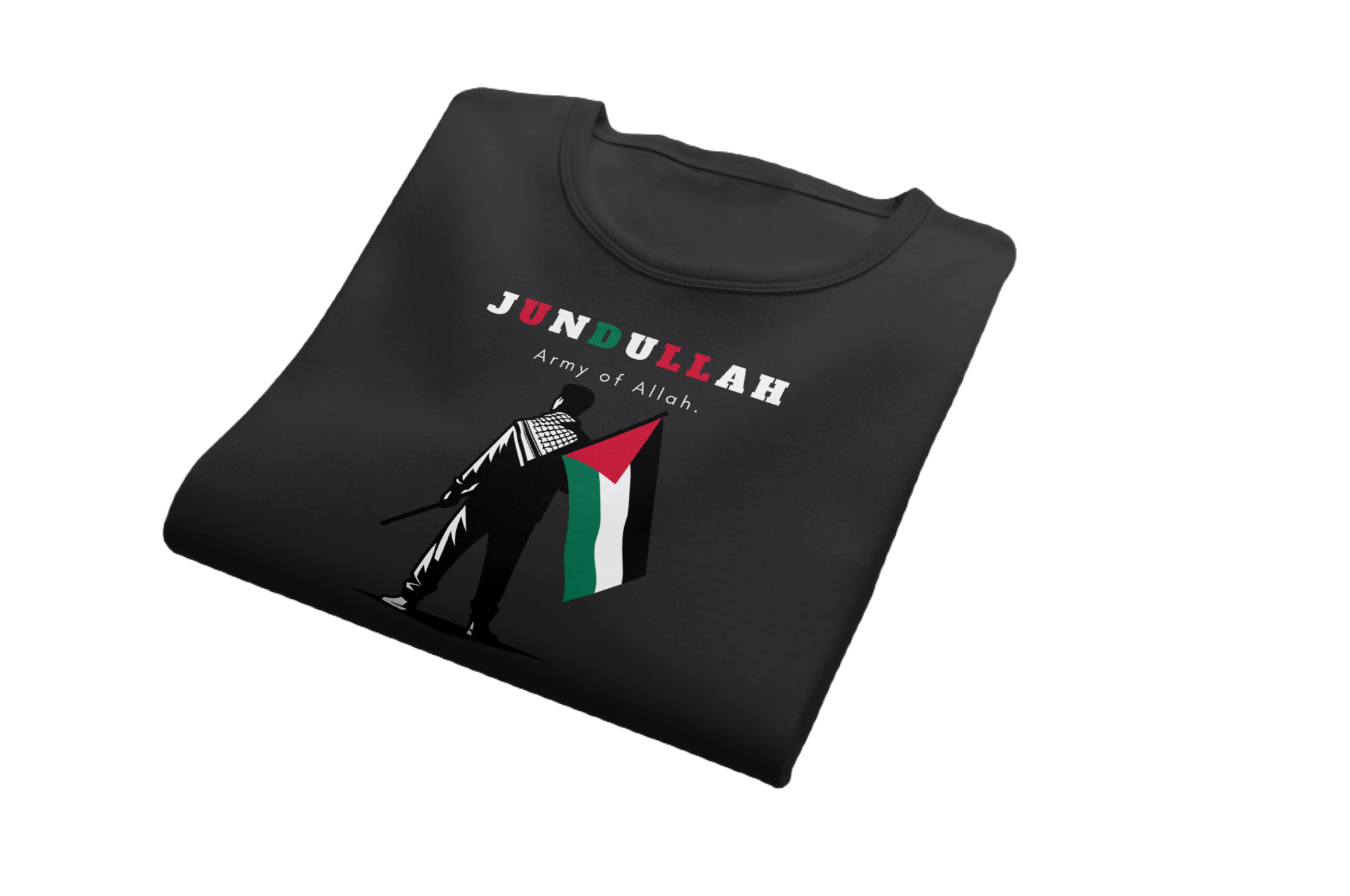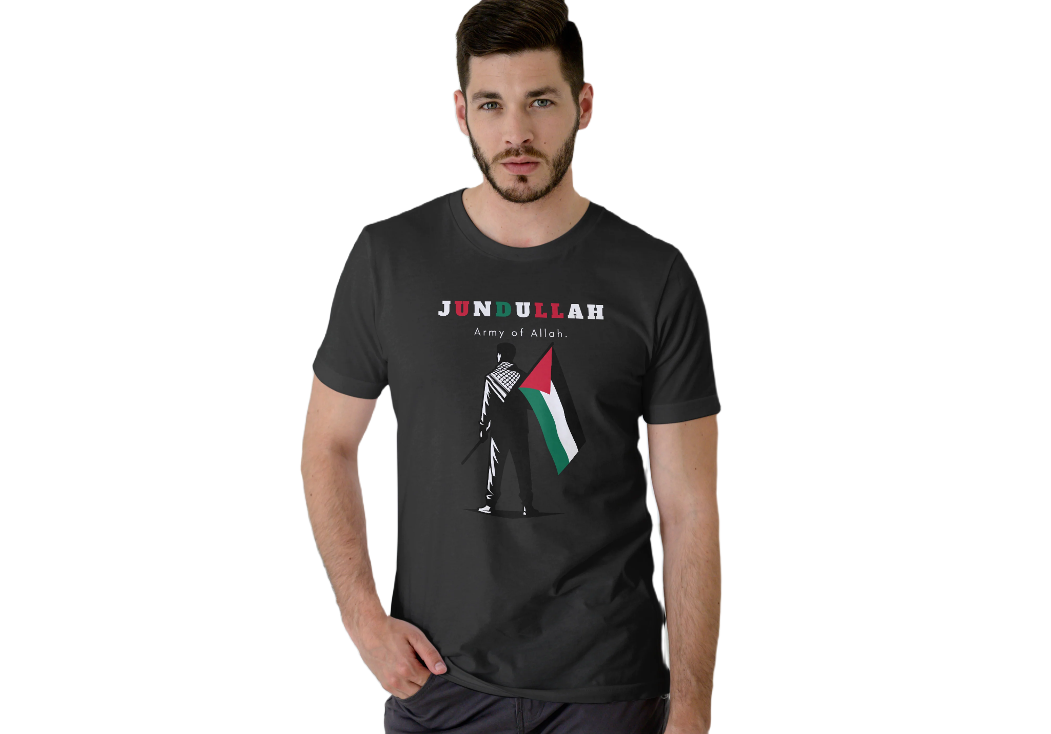 Show your unwavering faith and support with our Jundullah Islamic T-Shirt. This powerful design features the bold text "Jundullah" with "Army of Allah" below it, accompanied by an illustration of a man standing tall, holding the flag of Palestine. Crafted for comfort and style, this t-shirt is perfect for expressing your solidarity and pride. Ideal for casual wear or special occasions, it serves as a meaningful addition to your wardrobe.