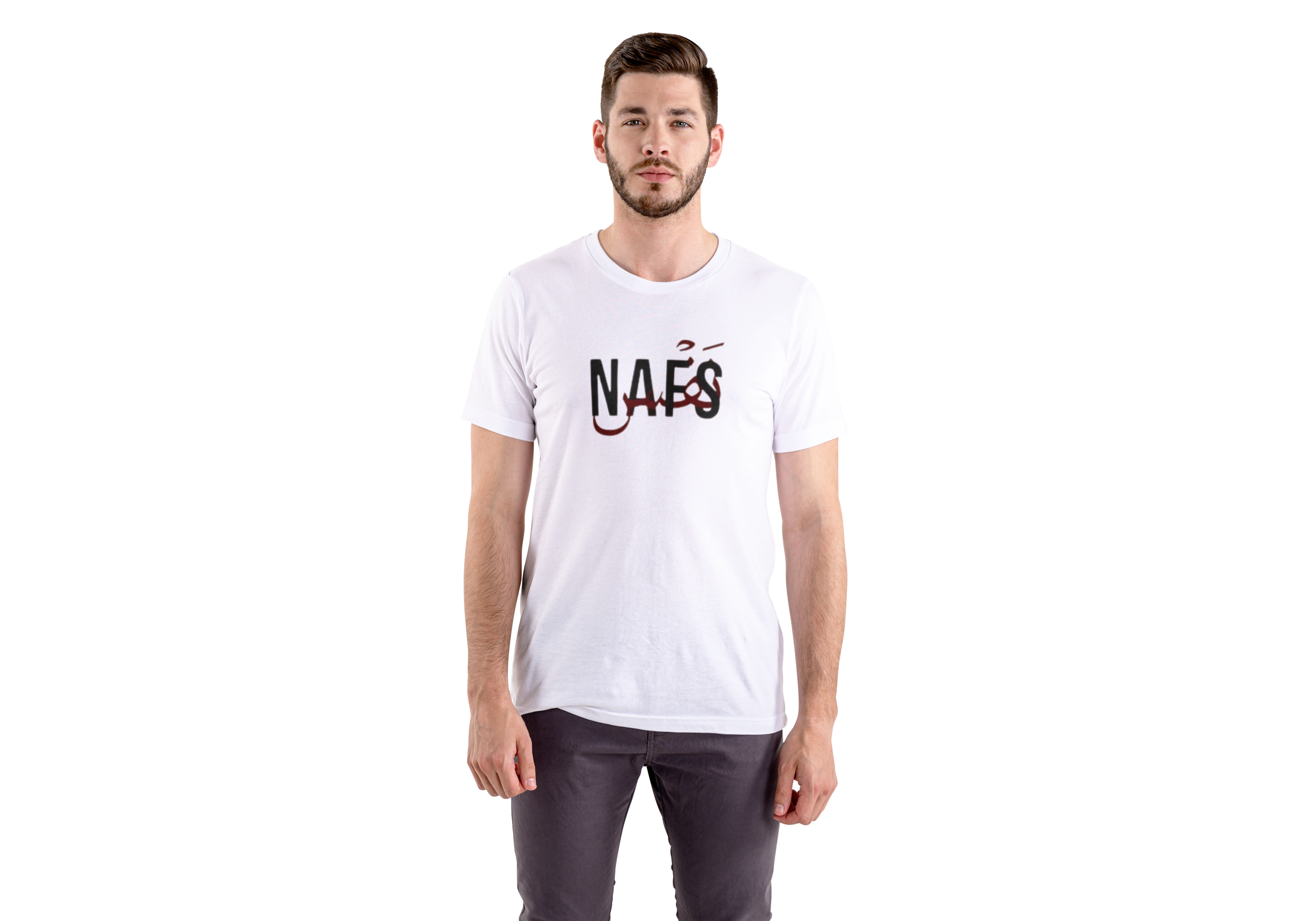 Round neck t-shirt with "Nafs" text, soft cotton fabric, sleek design, everyday comfort.