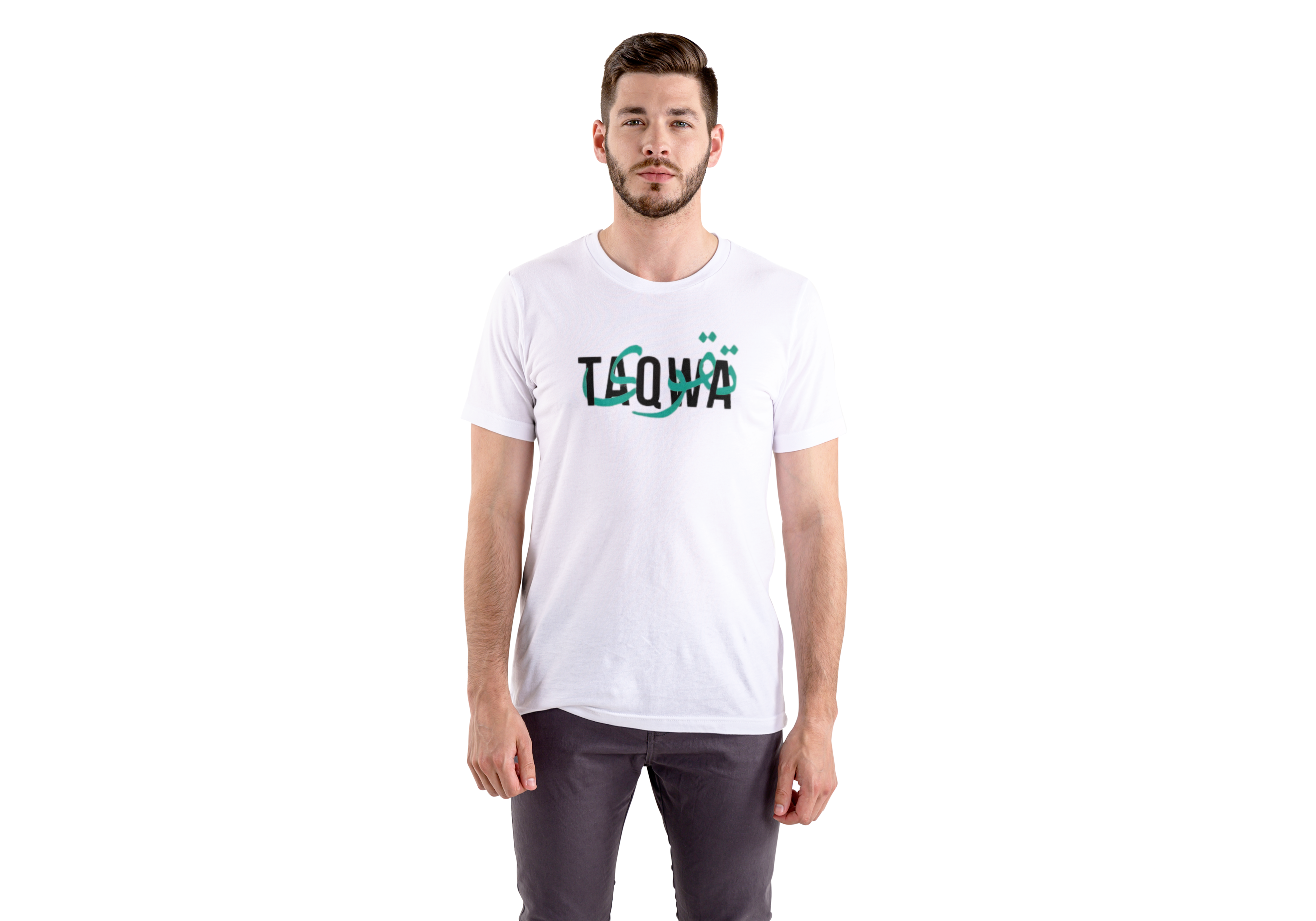 Round neck t-shirt with "TAQWA" text, premium quality cotton, durable print, soft fit.